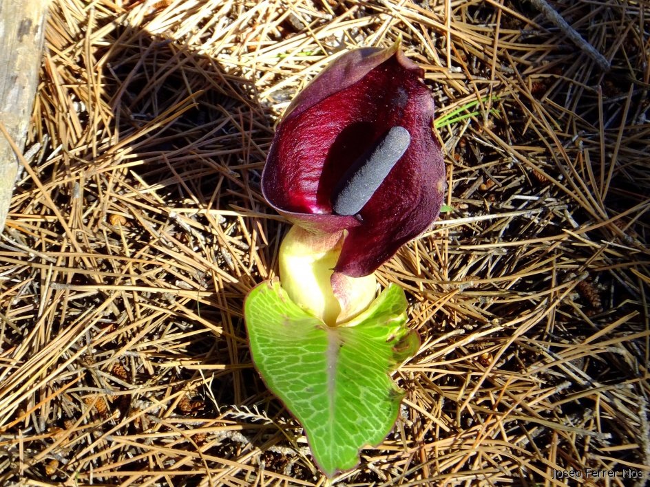 Arum pictum te fulles grans provistes de venossitats blanquinoses ben visibles i d'una fina línea vermellosa al marge de la fulla.