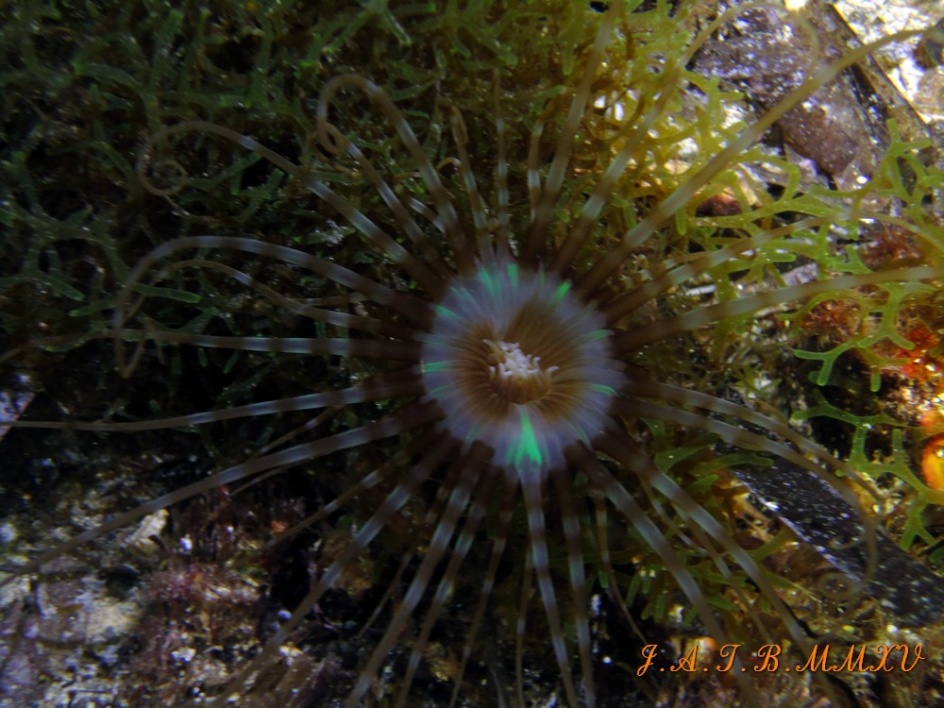 En esta anemona tubo se pueden observar las zonas de bioluminiscencia, solo observables en inmersiones nocturnas.