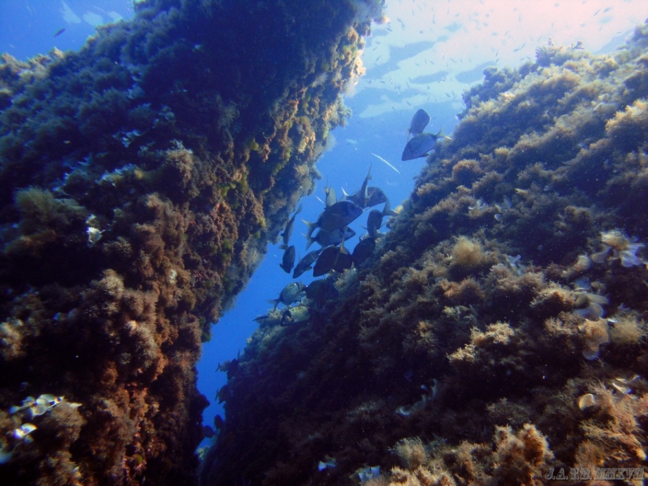 Bienvenido / Fotografias Submarinas / Fotografías Submarinas de Juan A. Torres / MOJARRAS EN UNA GRIETA