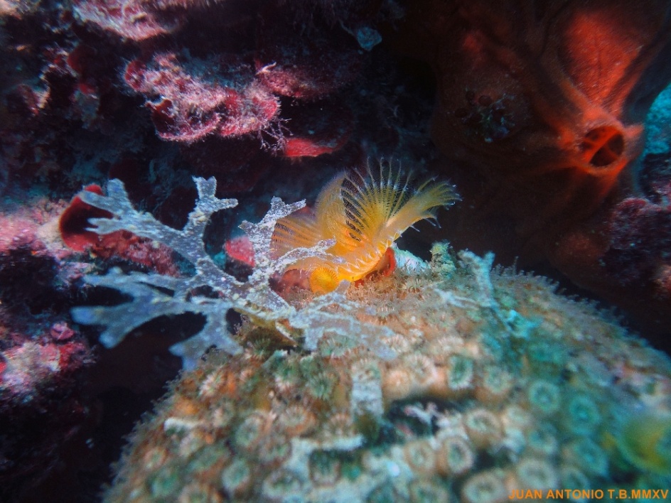 Se trata de un pequeño gusano que vive en el interior de las rocas y tan solo muestra el plumero de branquias con las que atrapa su alimento.