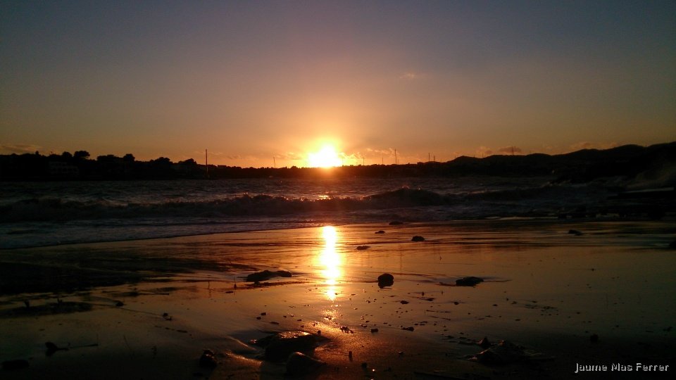 Puesta de Sol en s´Arenal de Portocolom, se ve reflejado el Sol en la arena, dia 31-01-2015