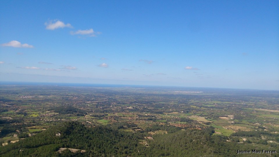 Puig de Sant Salvador mirando hacia el Sur, Santanyí se puede ver al fondo, dia 08-04-2015