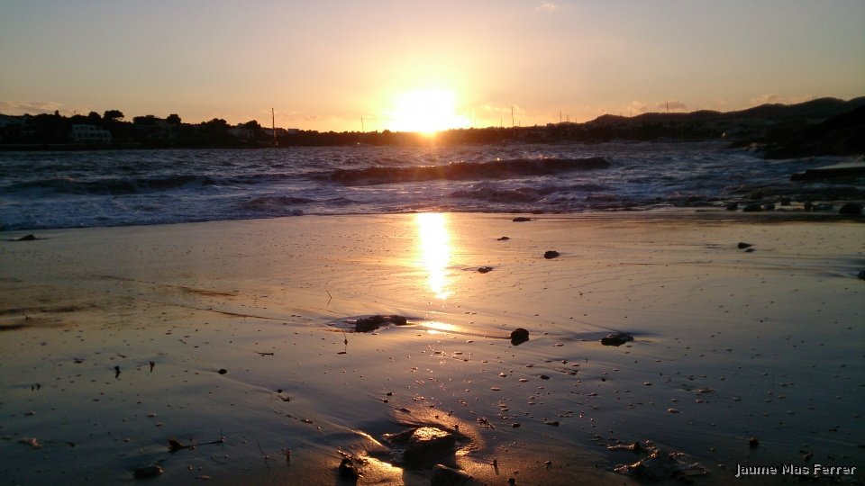 Atardeder desde s´Arenal de Portocolom, espejo en la arena, 31-01-2015.